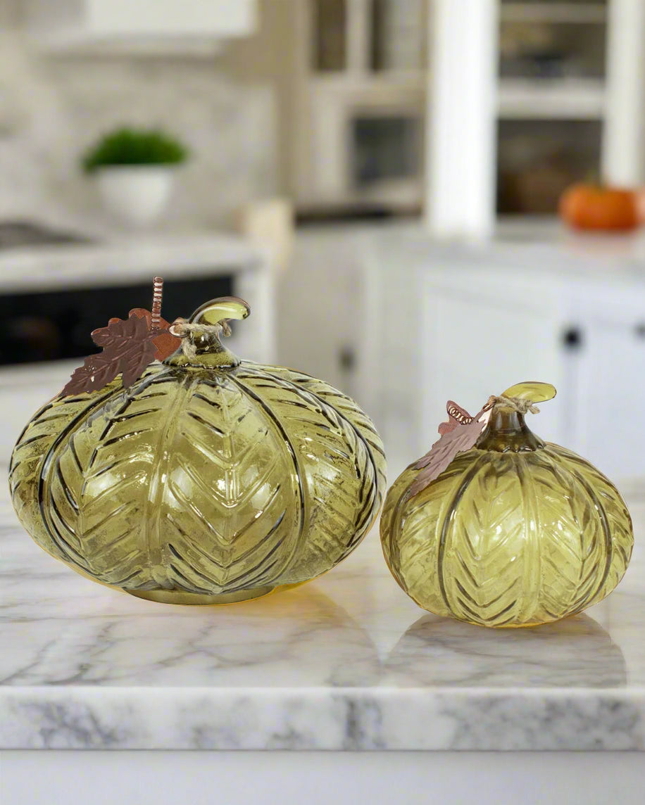 Vintage-inspired green glass with a real-looking stem and leaf for an heirloom feel.