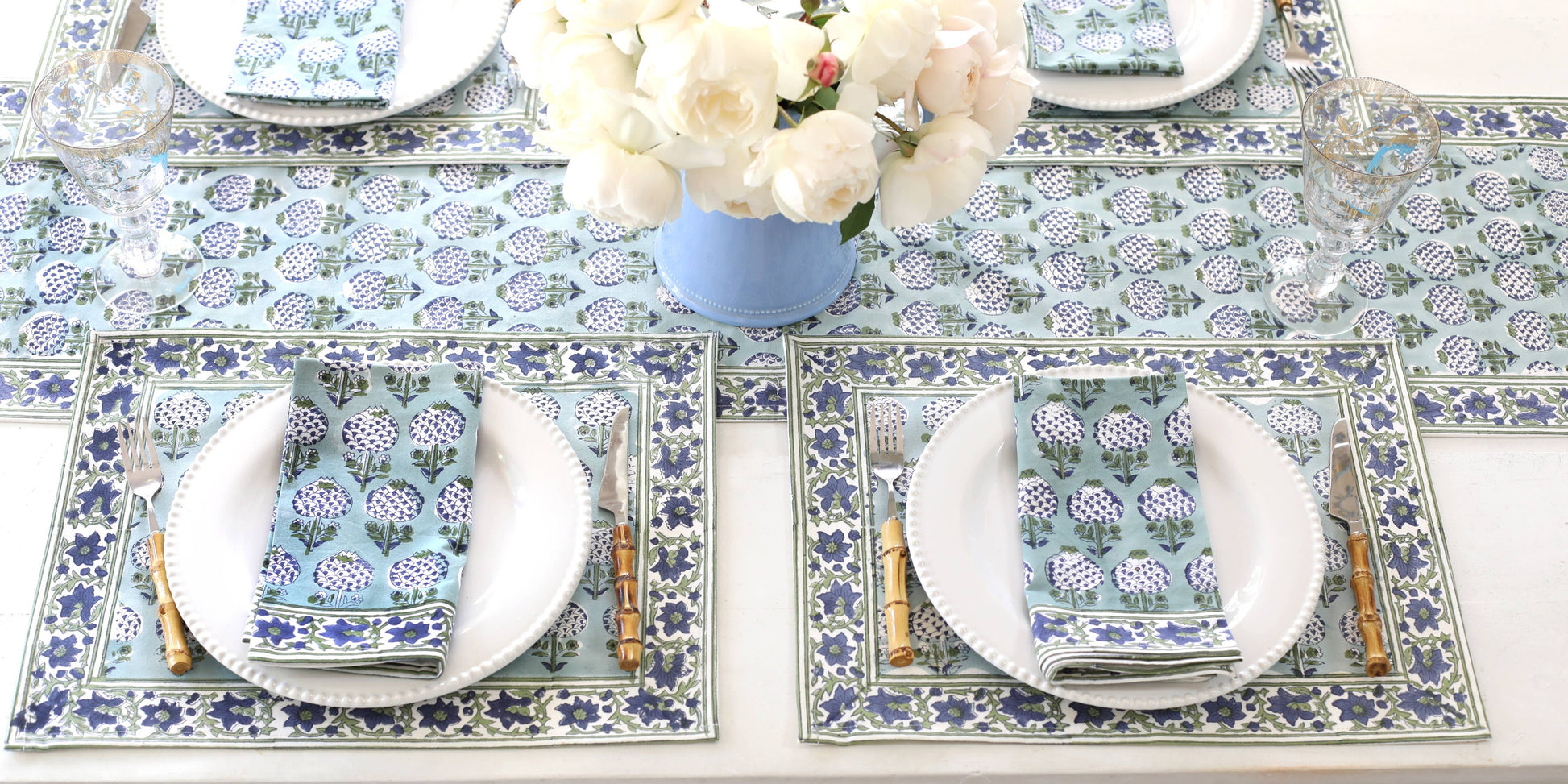 Handcrafted in soft cotton, our Granada Placemats bring timeless charm to your table. Featuring a rich blue-and-green block-print inspired by Andalusian tilework, they strike the perfect balance of everyday elegance and weekend entertaining.