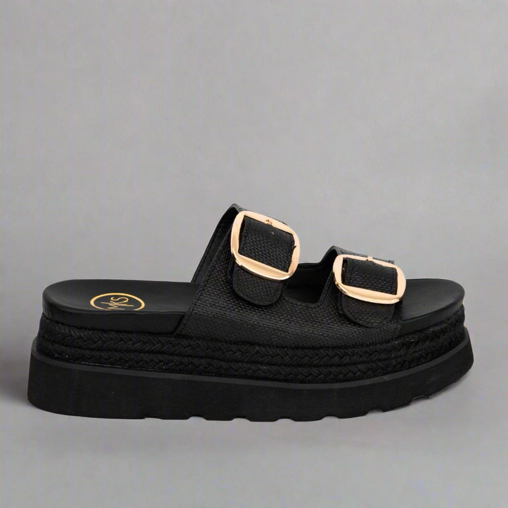 Meet your new summer essential—The Monique Wedge. Designed with double buckle straps and a cushioned platform sole, these elevated slides combine comfort and style effortlessly. The raffia-textured finish adds a subtle coastal feel, while the bold gold-tone buckles lend a touch of glam. Whether you're running errands, heading to brunch, or packing for vacation, these shoes check every box.