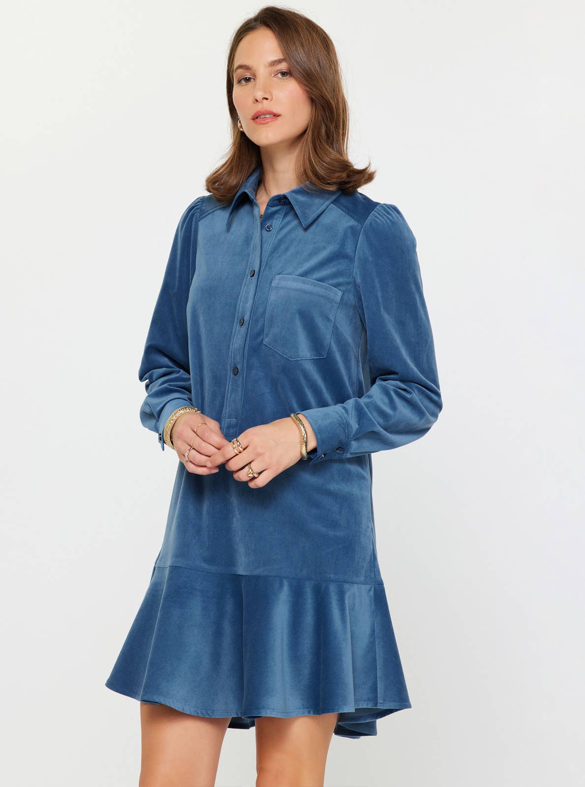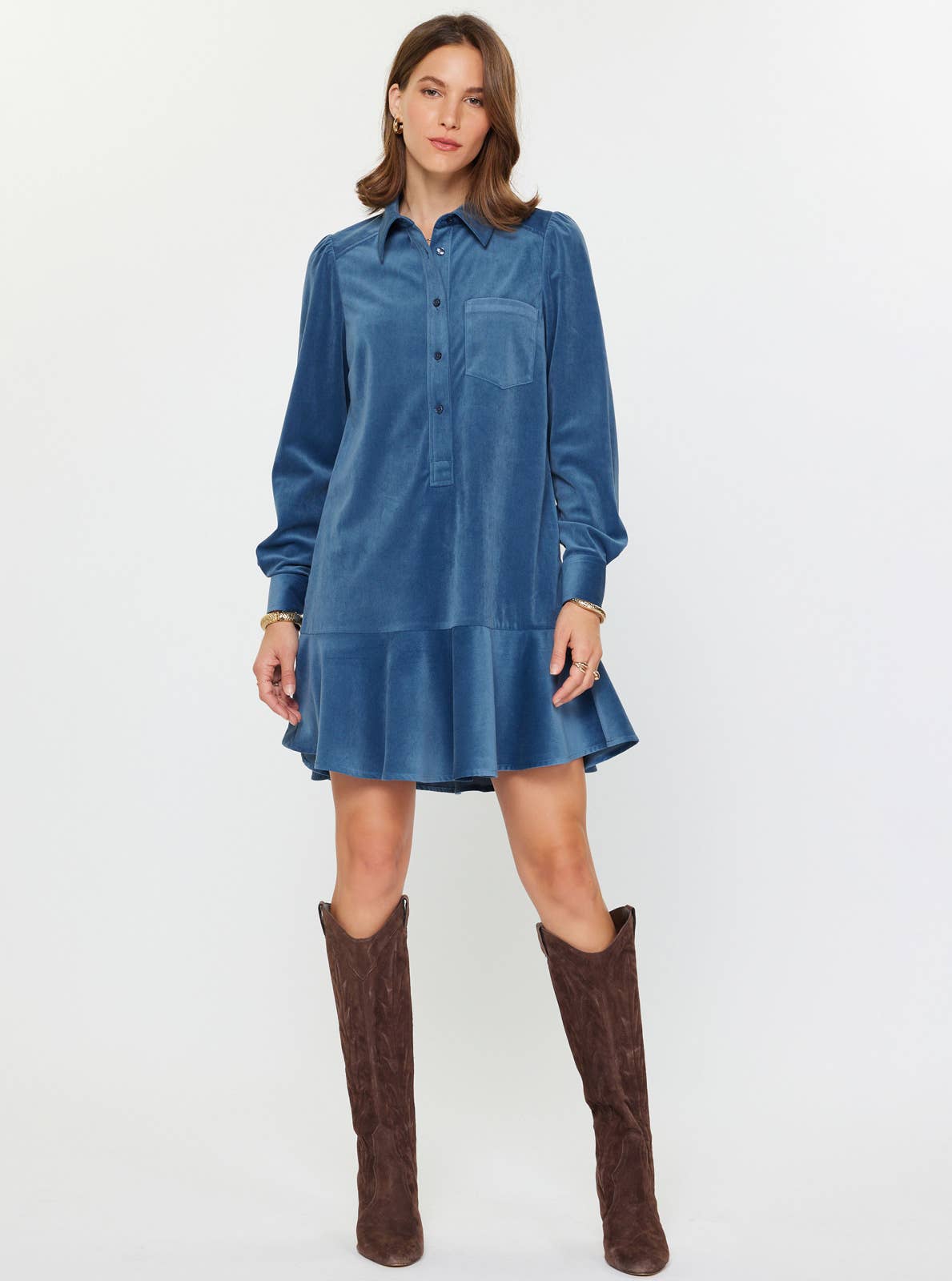 Soft, swingy, and beautifully feminine — the Caroline Fine Corduroy Mini Dress brings effortless charm to cooler seasons. Crafted from a lightweight, velvety corduroy with a subtle sheen, this dress drapes beautifully while still offering structure and shape. The steel blue tone feels refined and wintry, making it an easy piece to dress up or down.