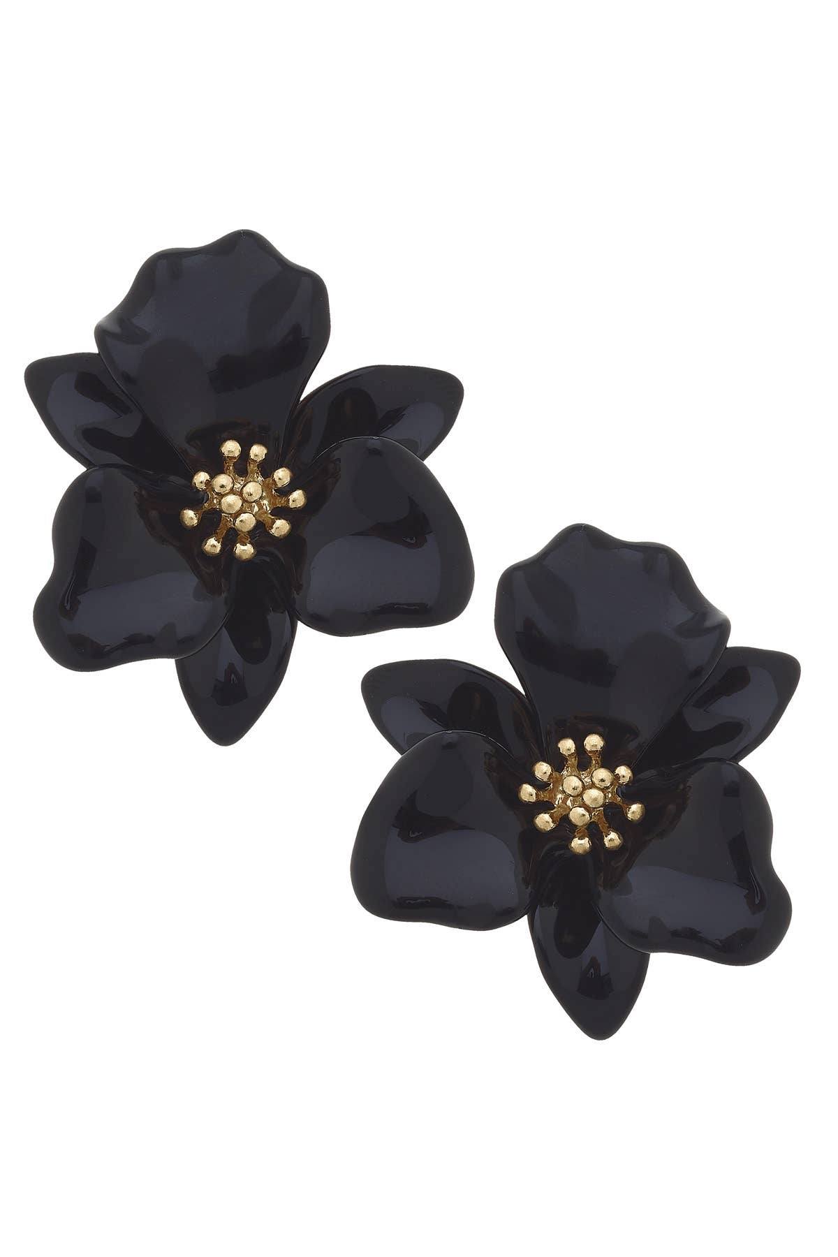 Description: Bold enamel-petal blooms with a beaded center—eye-catching, lightweight, and comfortable. Dress up denim or finish a cocktail look.